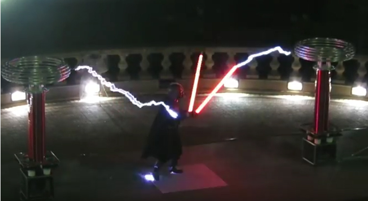 Due spade laser per far “suonare” delle Bobine di Tesla, ricreando la celeberrima Marcia Imperiale di “Star Wars”. Tanta roba.